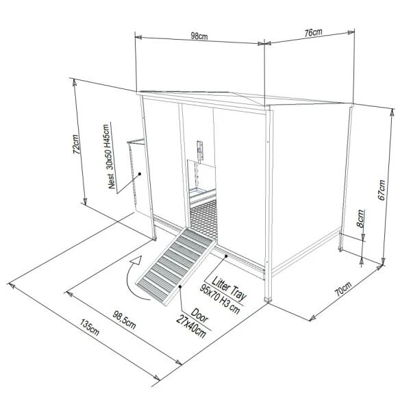 Het kippenhok Fontana is gegalvaniseerd en bestand tegen roest. In tegenstelling tot een kippenhok in hout is dit metalen hok onderhoudsvrij. Bovendien biedt het een uitstekende bescherming tegen vossen. De anti-slip loopbrug kan opgeklapt worden tot deur om het hok ‘s nachts te kunnen sluiten. Het is verder uitgerust met 2 zitstokken, een schuifdak, een nest en een mestlade om het makkelijk te kunnen reinigen.