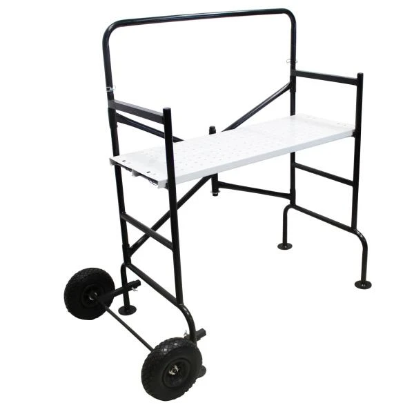 Met de twee transportwielen aan de voorzijde is de rolsteiger tevens makkelijk te verplaatsen. De stelling is aan één zijde voorzien van een reling waartegen je tijdens het klussen kan leunen. Te gebruiken bij het snoeien van struiken, scheren van hagen of in huis bij het schilderen.
